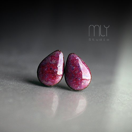 Oryginalne ceramiczne kolczyki w formie sztyftów, ręcznie wykonane z delikatnej gliny kamionkowej, jednostronnie szkliwione mieszanką różowych szkliw z efektem plamek, na antyalergicznych sztyftach w kolorze srebrnym. Długość ok 13mm