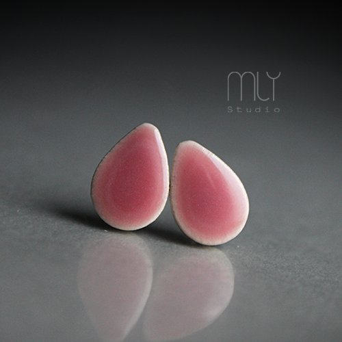 Oryginalne ceramiczne kolczyki w formie sztyftów, ręcznie wykonane z delikatnej gliny kamionkowej, jednostronnie szkliwione mieszanką różowych szkliw z efektem plamek, na antyalergicznych sztyftach w kolorze srebrnym. Długość ok 13mm
