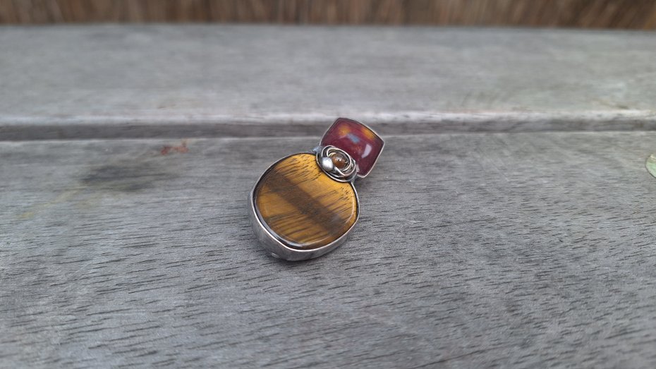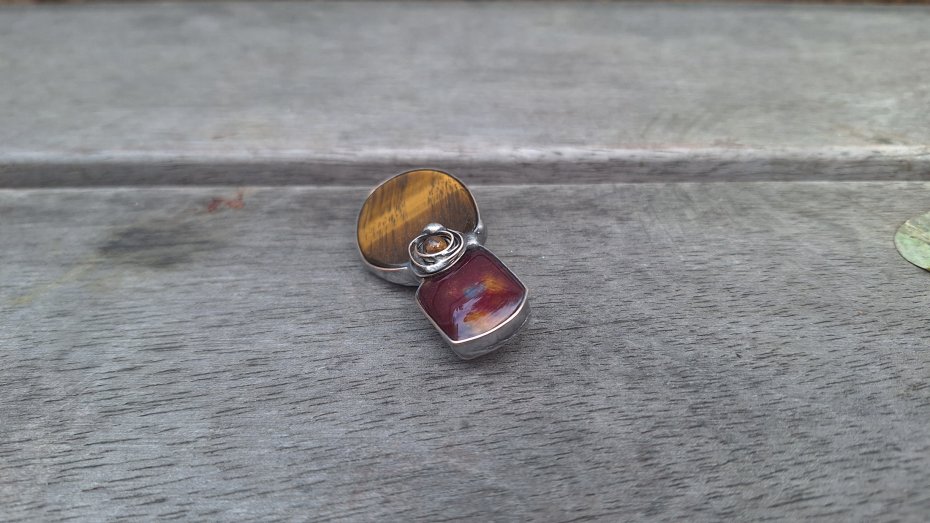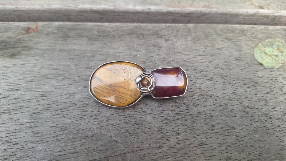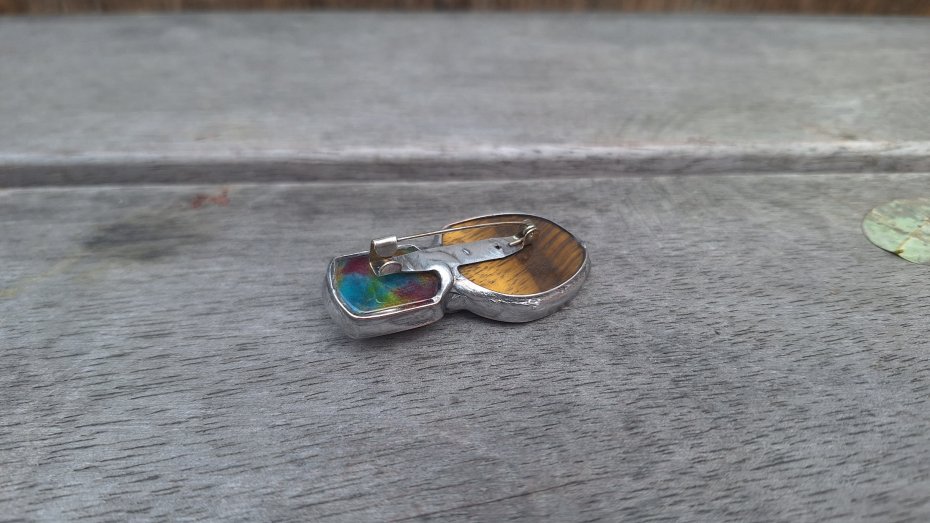 Broszka wykonana z miedzi, cyny, jaspisu i tygrysiego oka. Wymiary ok. 5 na 2 cm. Zapięcie metalowe.