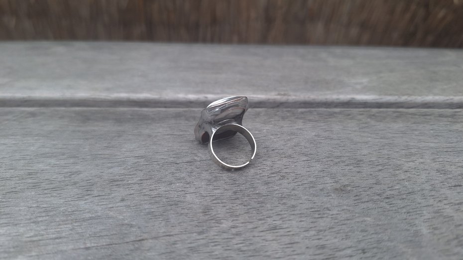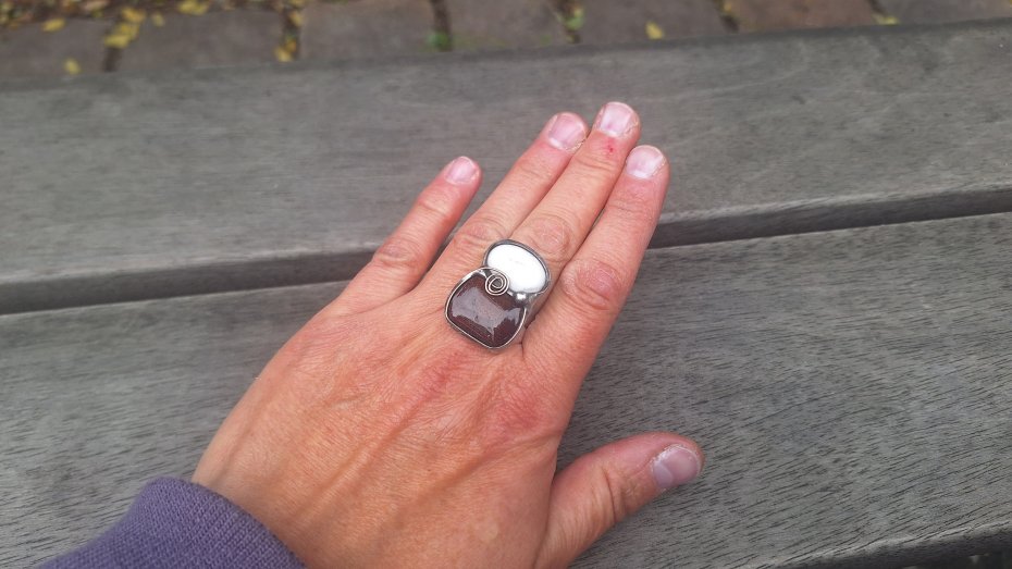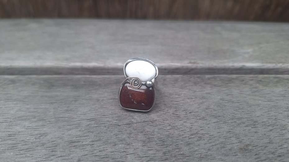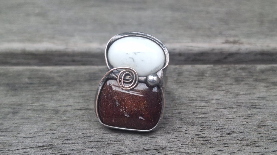 Pierścionek wykonany z miedzi, cyny, howlitu i jaspisu. Wymiary ok. 2.7 na 1.8 cm. Regulowany. Nie jest ciężki.