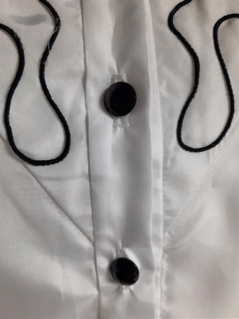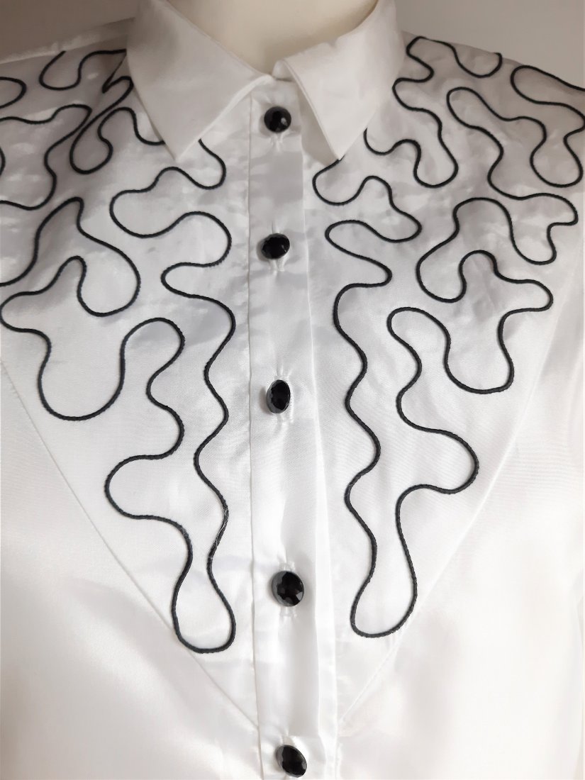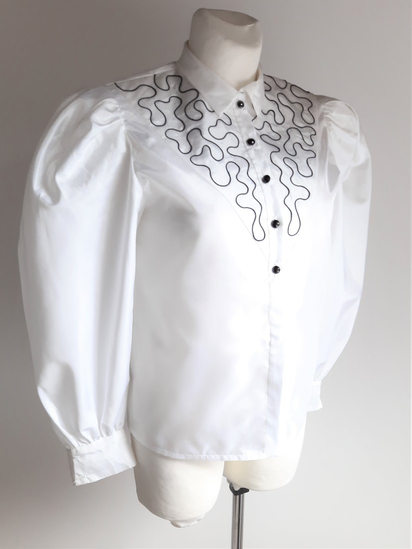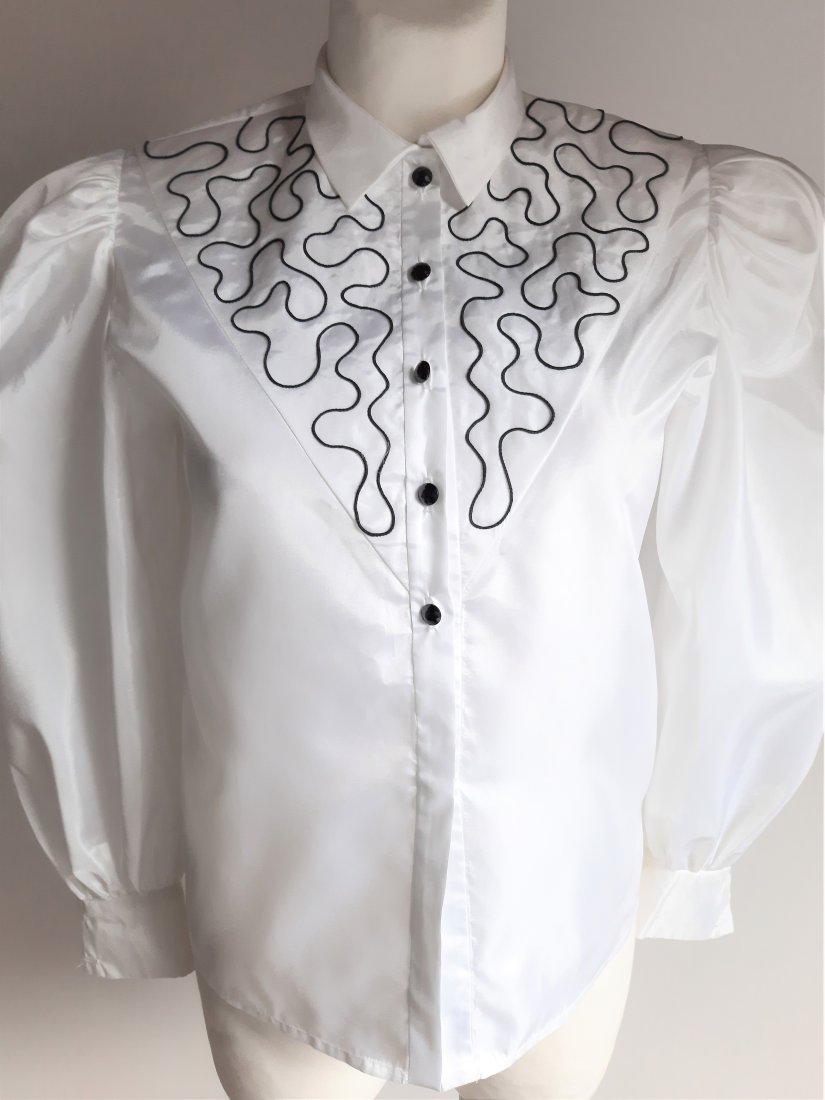 przepiękna biała bluzka vintage z lat 80-tych z ogromnymi bufiastymi rękawami, z przodu kontrastowe zawijasy z czarnego sznurka, niewielki kołnierzyk, w ramionach marszczenia oraz poduszki, długi rękaw z mankietem zapinanym na dwa guziki, bluzka zapinana na czarne ozdobne guziki oraz na haftkę po szyją i zatrzask w dole bluzki, cienki, śliski, "szeleszczący" materiał