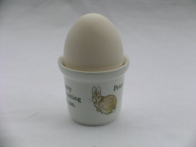 Szlachetnie porcelanowy kieliszek na jajko, sygnowany najwyższą jakością Wedgwood, ze śniadaniowej dziecięcej serii z kultowymi ilustracjami Peter Rabbit od Beatrix Potter. Dół 4,5; góra 5,5; wys. 5 cm. Stan zachowania bardzo dobry.