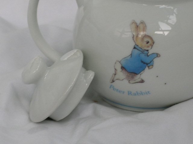 Uroczy porcelanowy imbryczek z kolekcjonerskiej serii z postacią Królika Piotrusia z kultowymi ilustracjami Beatrix Potter. Oryginalna, sygnowana edycja F. Warne z 2008 roku. Prostota graficznej kompozycji z urzekającą niebieskością, klasyczna forma, błyszczące szkliwienie. Przykrywka z języczkiem blokującym. Niewielki, a poręczny :)