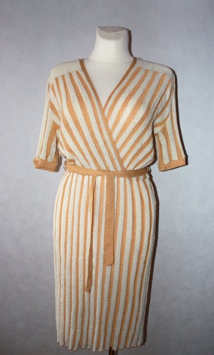 wyjątkowa dzianinowa sukienka vintage z lat 70-tych w pasy kremowo-beżowe, wiązana w pasie, krótki rękawek, na podszewce, rozciągliwa