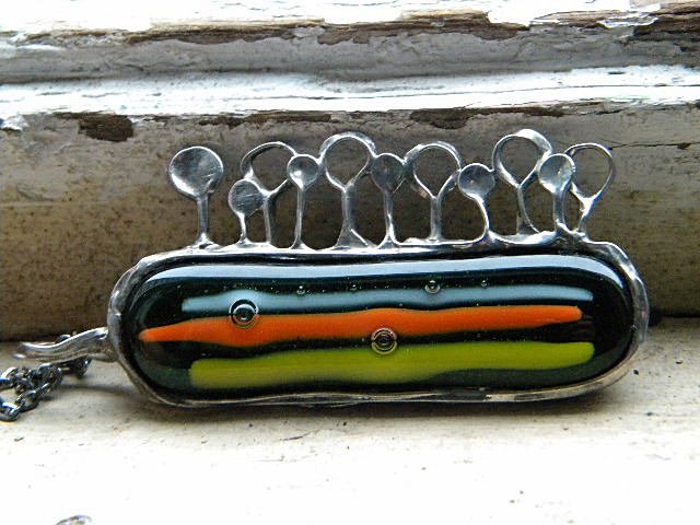 naszyjnik. szkło oprawione w ocynowaną miedz. stylizowany na stare srebro. wymiary zawieszki 7,5cm x 3,3cm. Kolor tła w szklanej zawieszce to tzw "szmaragd Nilu" mieniący sie na zielono,taki jakby piasek pustyni tylko,że zielony... łancuszek z posrebrzanej,oksydowanej miedzi.zapiecie z oksydowanego srebra 925. Łańcuszek o długości 90 cm