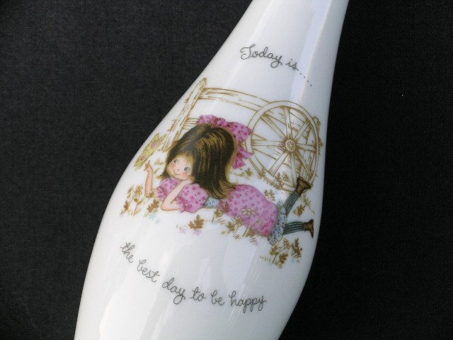 Wysmukły porcelanowy wazonik z ilustracją z kultowej dziewczęcej serii Petticoats & Pantaloons, kolekcjonerski, oryginalnie sygnowany, japoński. Dół 4,5; pękatość 6,5; góra 3; wysokość 18,5 cm. Błyszczące szkliwienie. Stan zachowania bardzo dobry.