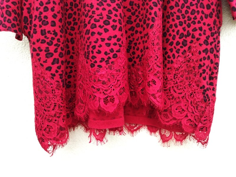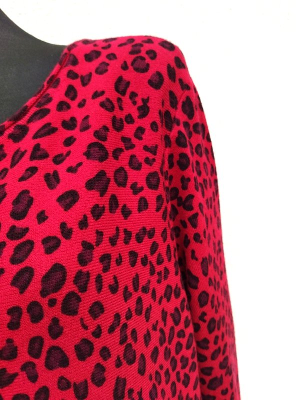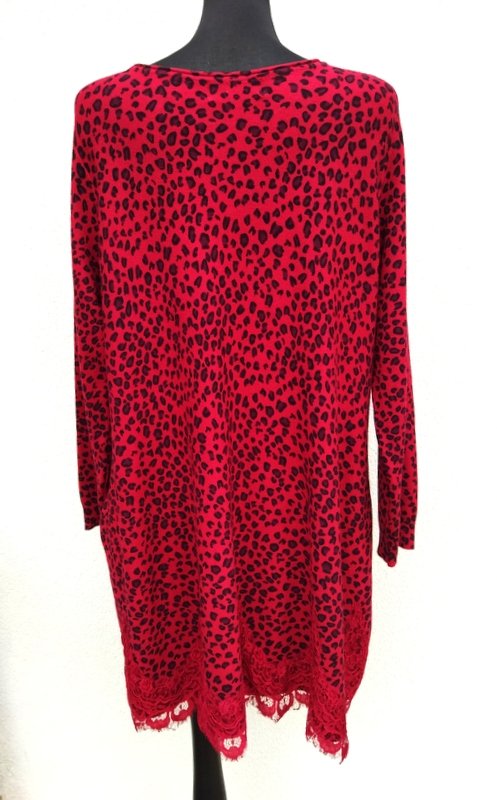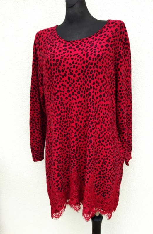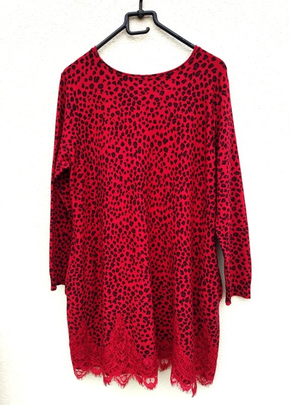 Miła, mięciutka dzianinowa sukienka lub tunika w kolorze jarzębinowej czerwieni w czarne cętki, dół sukienki zdobiony naszywaną czerwona koronka. Swobodny trapezowy fason z owalnym dekoltem , z dwiema wpuszczanymi kieszeniami w szwach bocznych. podatna i rozciągliwa