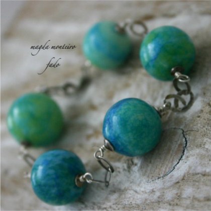 Bransoletka wykonana została całkowicie z ręcznie oksydowanego i polerowanego srebra próby 925. Kamienie: pięknie wybarwione chryzokole (1,6- 1,8
