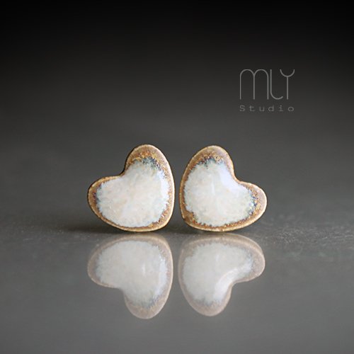 Ceramiczne kolczyki w formie sztyftów, ręcznie wykonane z delikatnej czekoladowobrązowej gliny kamionkowej, jednostronnie szkliwione mieszanką beżowo kremowych szkliw z efektem plamek, na antyalergicznych sztyftach w kolorze srebrnym. Średnica ok. 12mm. Polecam