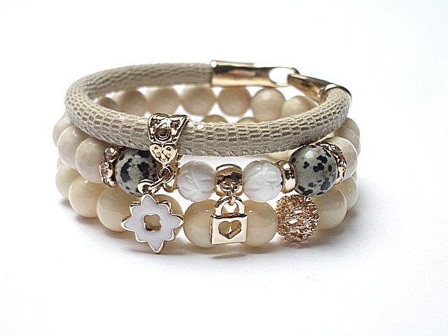Komplet trzech bransoletek wykonanych z naturalnych kamieni: fasetowany marmur [10mm], jaspis dalmatyńczyk [10mm], rzeźbiona muszla[10mm], szklanych perełek [10mm], rzemienia z naturalnej, miękkiej, cielęcej skóry [śr. 6mm] oraz elementów metalowych w kolorze tzw. różowego złota. Bransoletki z kamieni i perełek na gumce silikonowej. Pasują na nadgarstek 16-17cm. W przypadku zmiany rozmiaru bransoletek prosimy o wcześniejszy kontakt. Biżuteria ozdobnie zapakowana.