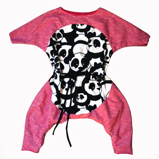 Śliczna, wygodna pidżamka/śpiochy wykonana z miękkiej, dresowej dzianiny w kolorze różowy melanż oraz z dzianiny dresowej z nadrukiem w pandy. Wykończona surowo, możliwość przewiązania w pasie dzianinowym sznurkiem. Pidżamka zapinana w kroku na zatrzaski.