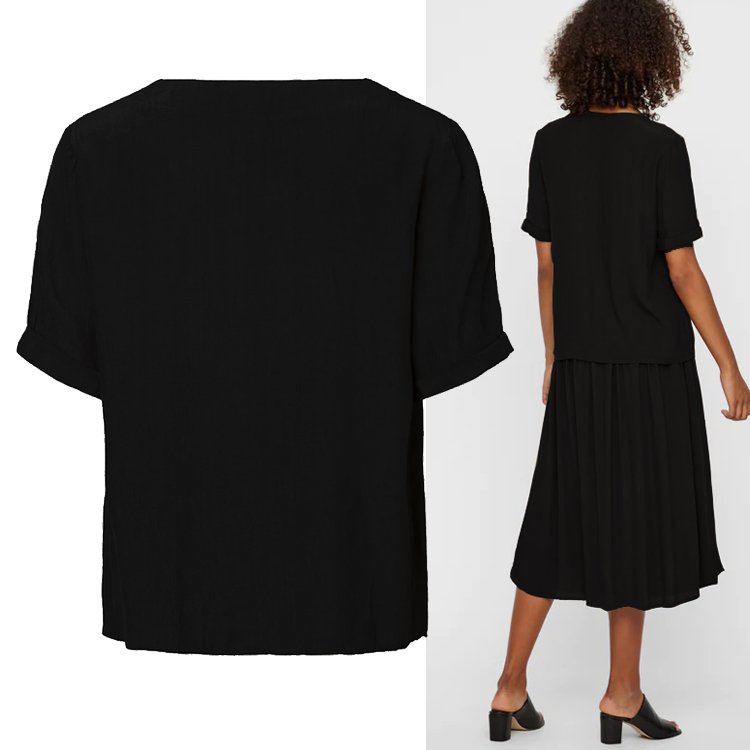 Luźna bluzka damska z przyjemnej, czarnej, lejącej wiskozy. Zapinana z przodu na rogowe guziki, dekolt V, rękawy krótkie zakończone wywinięciem.