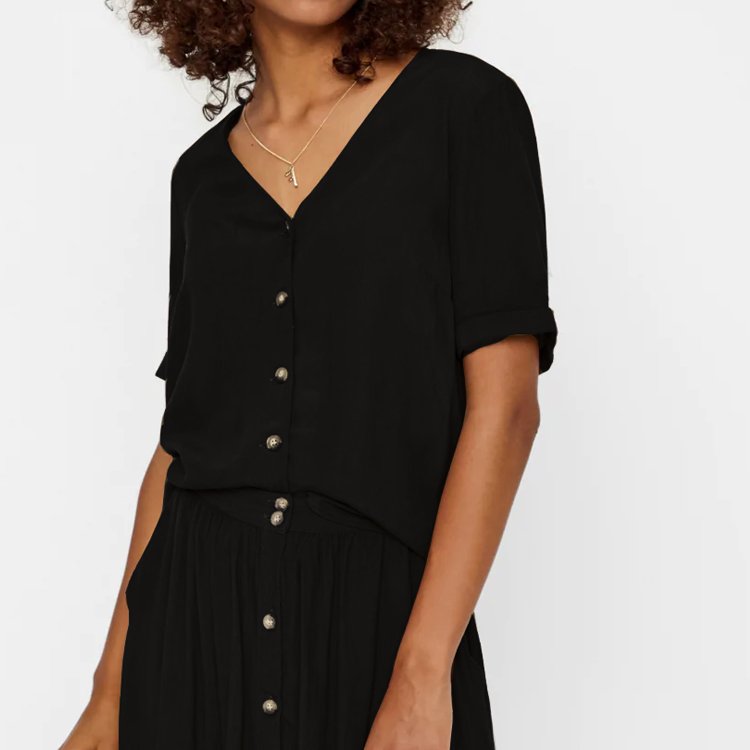 Luźna bluzka damska z przyjemnej, czarnej, lejącej wiskozy. Zapinana z przodu na rogowe guziki, dekolt V, rękawy krótkie zakończone wywinięciem.