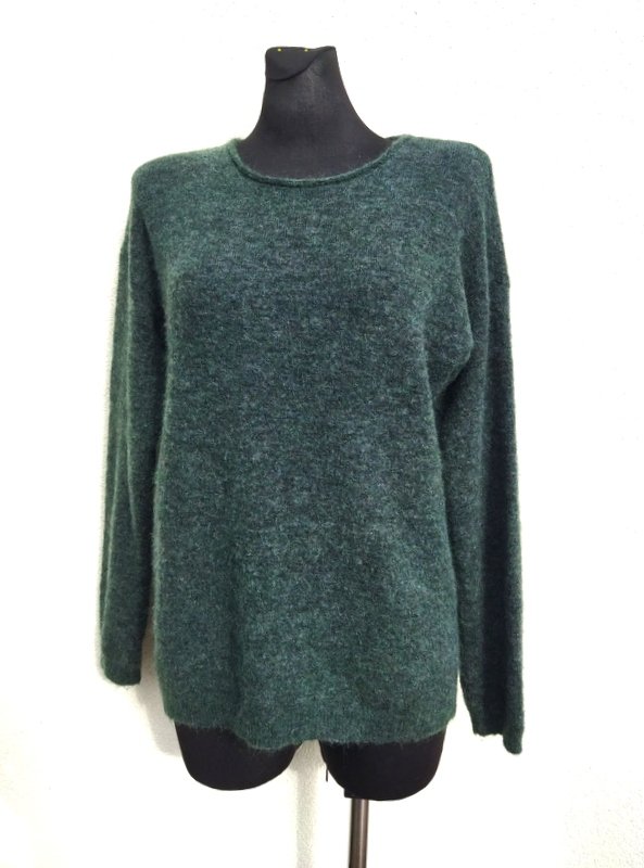 Dobry gatunkowo sweter w kolorze melanżowej morskiej zieleni. Owalny dekolt z odwijaną pliską , po bokach małe rozcięcia, nieco dłuzszy tył. Wykończony ściągaczami