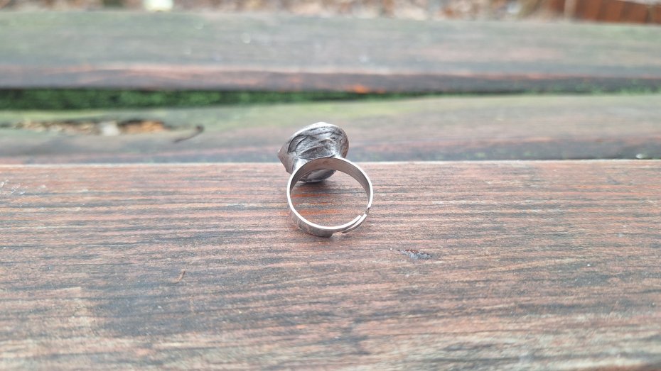 Pierścionek wykonany z miedzi, cyny i jadeitu. Wymiary ok. 2 na 1.5 cm. Regulowany. Nie jest ciężki.