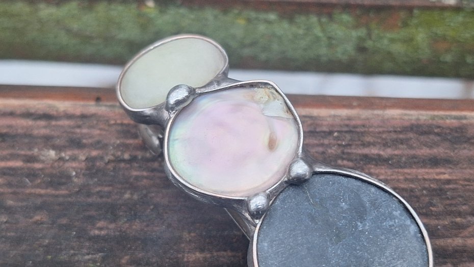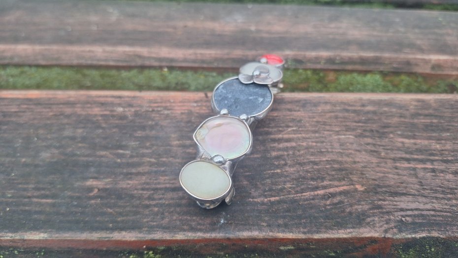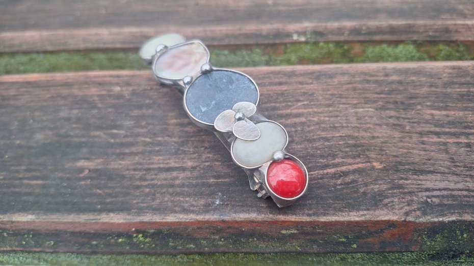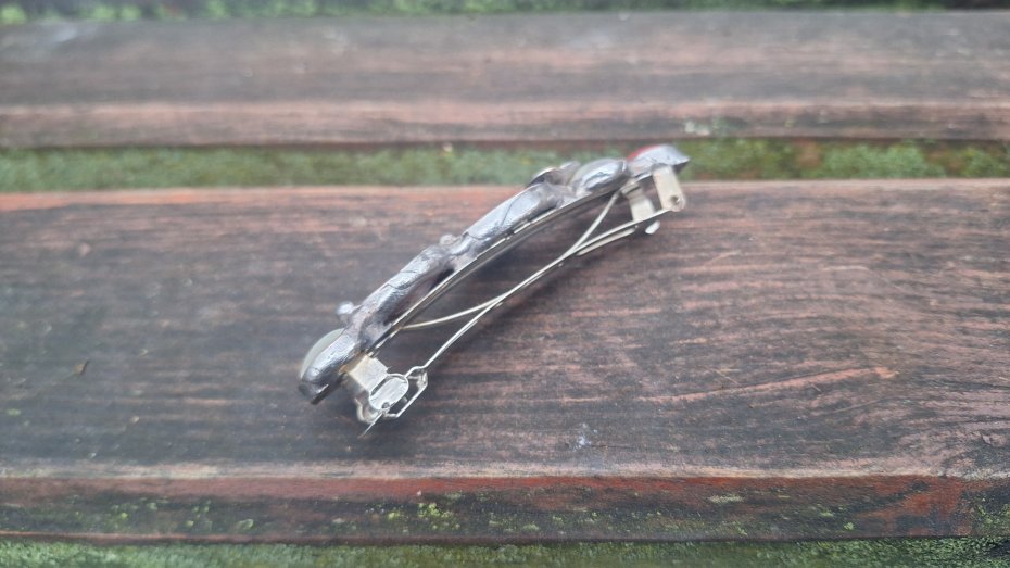 Klamra do włosów, wykonana z miedzi, cyny, agatu, perły i howlitów. Wymiary ok. 8 na 2 cm. Zapięcie 6 cm, metalowe.