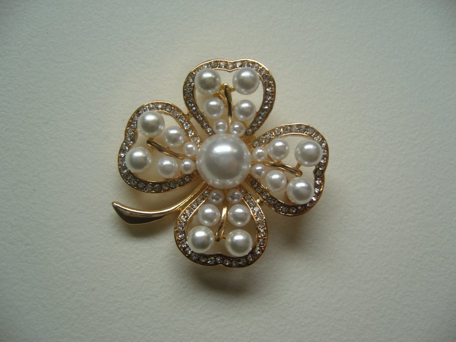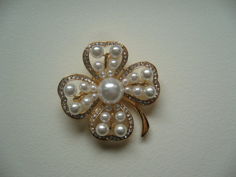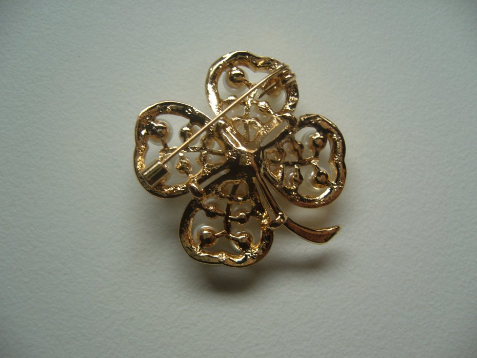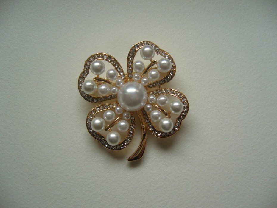 PIĘKNA POZŁACANA BROSZKA CZTEROLISTNA KONICZYNA NA SZCZĘSCIE ZDOBIONA PEREŁKAMI I CYRKONIAMI