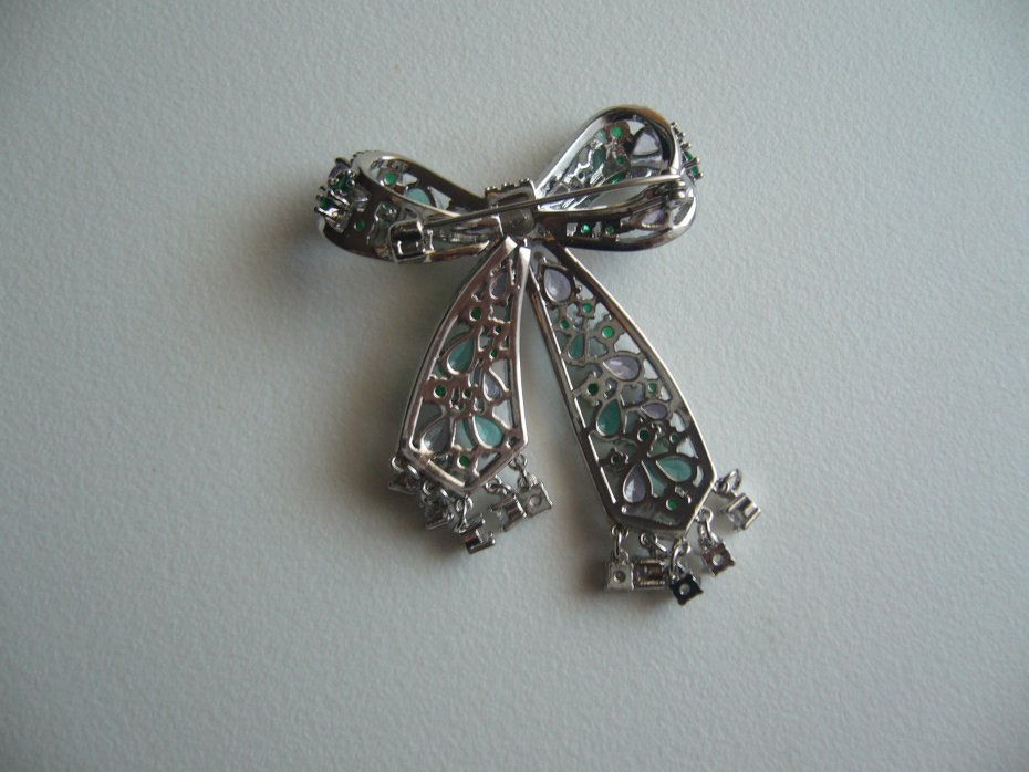 PIĘKNA POSREBRZANA BROSZKA KOKARDA WYSADZANA SZKLANYMI CYRKONIAMI W KOLORZE ZIELONYM FIOLETOWYM I PRZEŹROCZYSTYM
