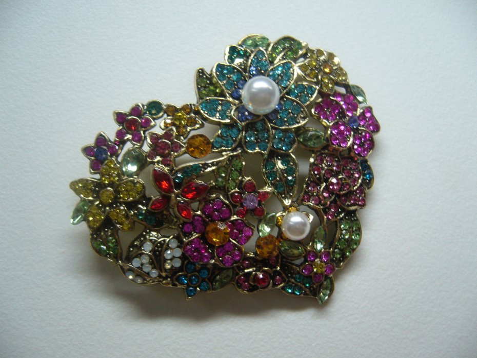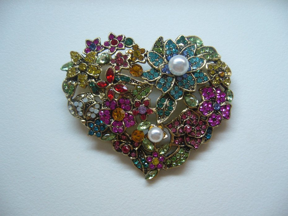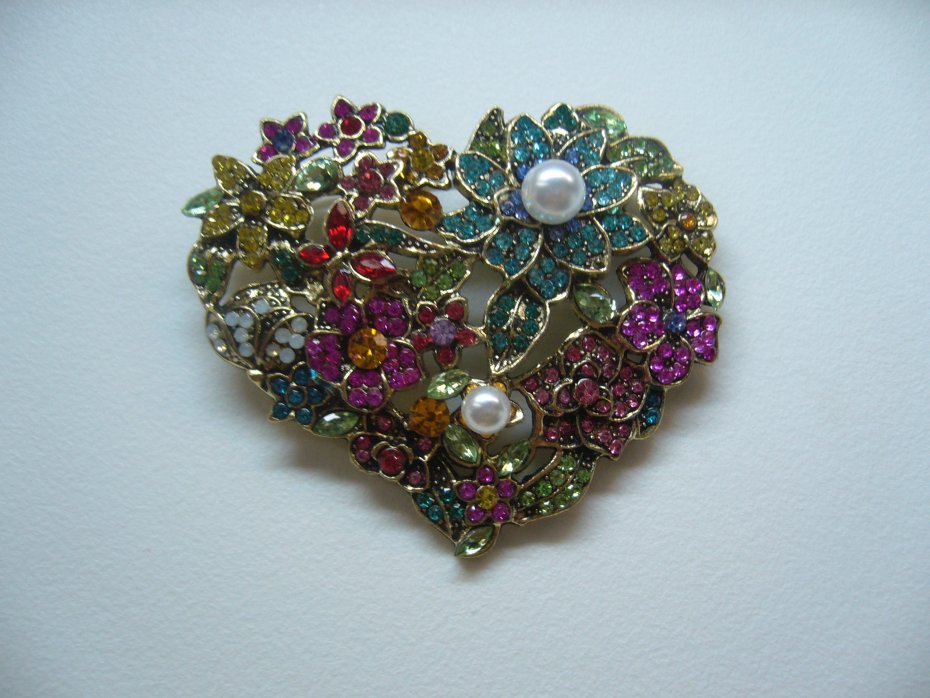 PIĘKNA POZŁACANA BROSZKA SERCE ZDOBIONA PERŁAMI I CYRKONIAMI