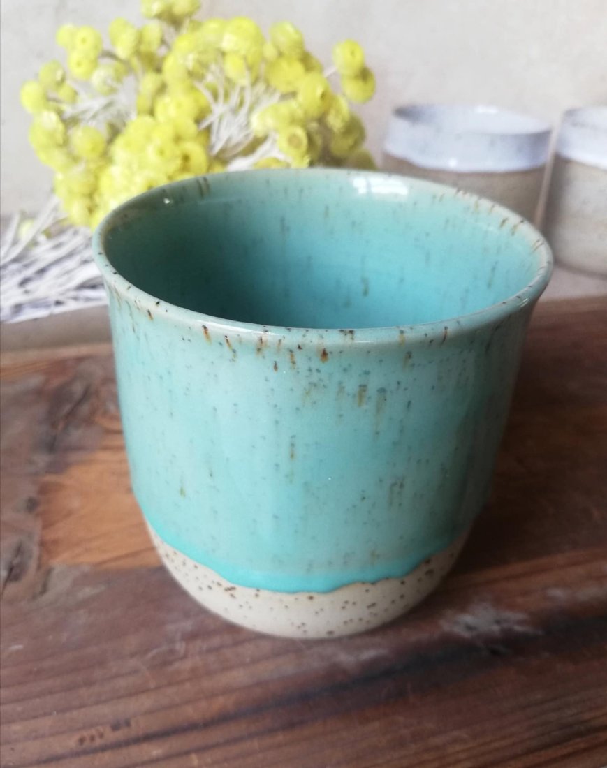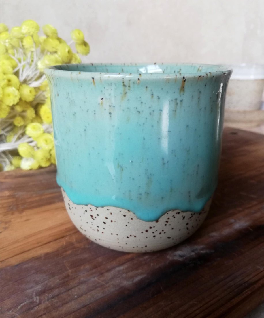 UNIKALNA CZARKA KAMIONKOWA 300 ML wykonana ręcznie na kole garncarskim pokryta miętowym szkliwem ceramicznym.