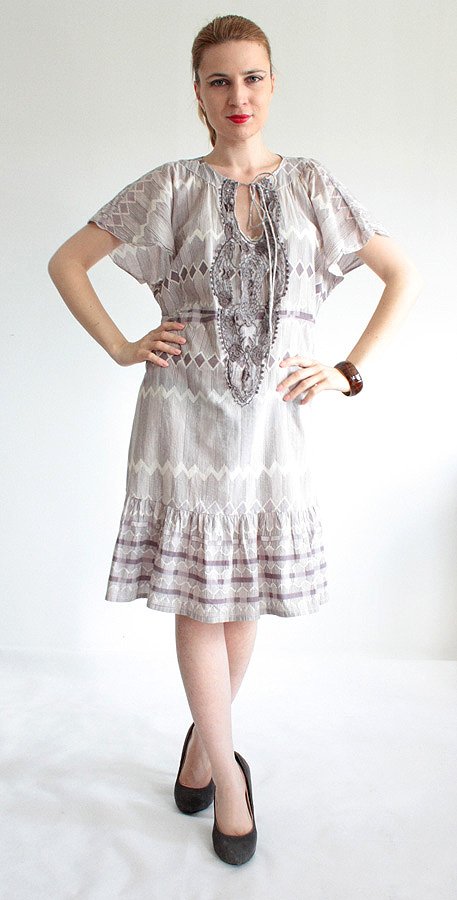 Piękna sukienka w lawendowych odcieniach, z ciekawymi detalami. Materiał to prawdopodobnie bawełna lub wiskoza.