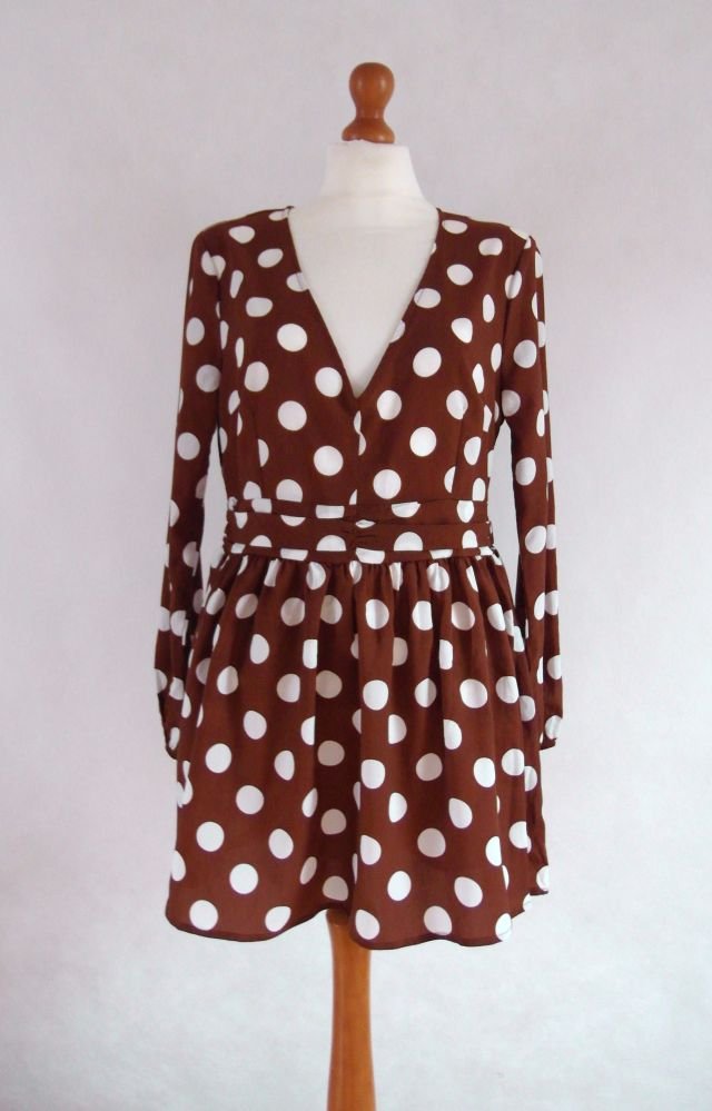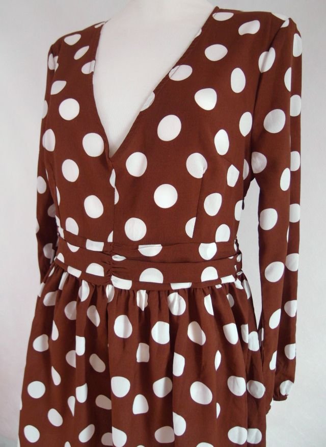 kolor piernikowy i białe grochy.W pasie odcięta, z boku na suwak. Rękawy u dołu w gumkę. Świetna na tańce.