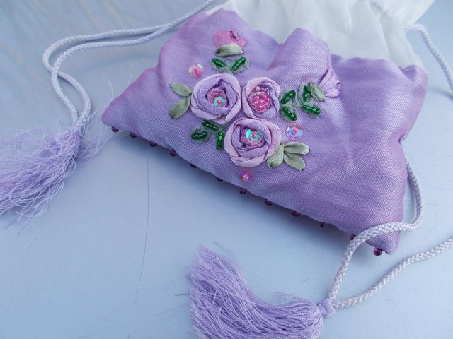 Woreczek zdobny wielce. Do zapakowania prezentu,zdobnego przechowywyania ...Materiałowy, ciekawie zdobiony...koraliki, dwa rodzaje materii...cienka satyna i bliżej mi nie znany nieco grubszy połyskliwy...ręcznie formowane kwiecie...i ściągnięcie całości z chwostami. ...Całość lekko połyskująca w kolorach różo-fioltó...z perłową bielą i szczyptą zieleni.