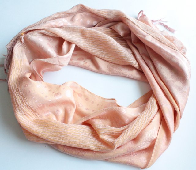 Miękki, duży szal w niejednolitym kolorze w subtelne wytłaczane wzory. Są to różne odcienie pudrowego różu i brzoskwini.