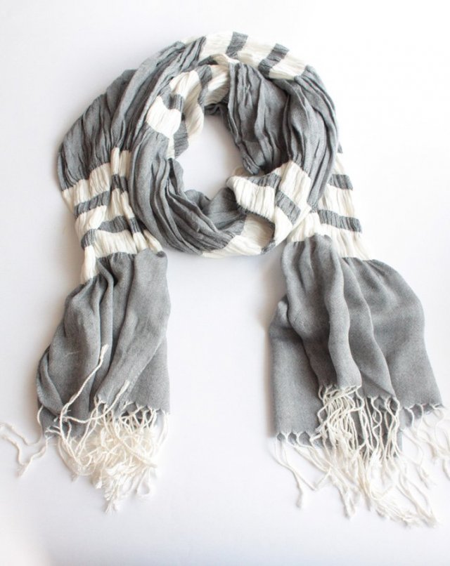 Duży, miły w dotyku, sprężysty szal w biało-szare pasy. Wykończenie frędzlami. Można aranżować go na wiele sposobów.