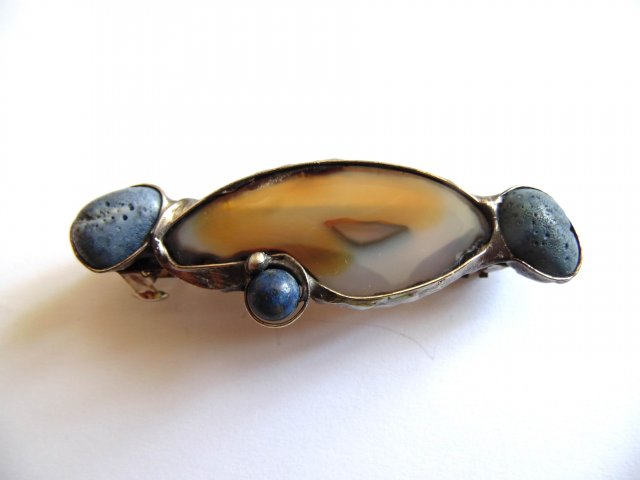 Klamra do włosów, wykonana z miedzi, cyny, agatu, koralowców i lapis lazuli. Zapięcie metalowe, automatyczne. Wymiary ok. 8 na 2,5 cm.