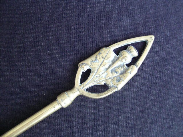 Fantastyczny pogrzebacz z mosiądzu. Ciężki, z ostem zdobioną rączką. Świetny w okolice grilla, kominka... Stylizowana rączka pozwala na odwieszenie. Długość 43; szer. 3,5 cm. Stan zachowania mosiężnie dobry plus (końcówka nosi oczywiste ślady użytkowania :)