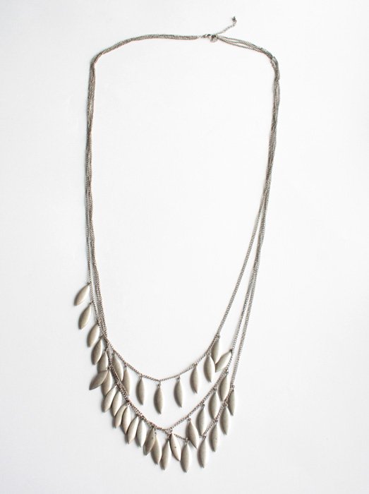 Długi naszyjnik w kolorze srebrnym składający się z kilku łańcuszków.