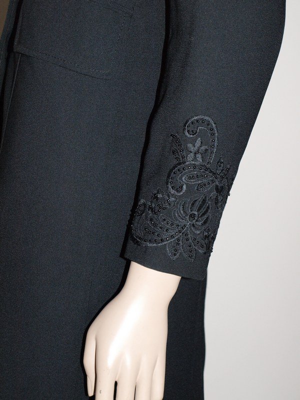 przepiękny czarny, taliowany płaszczyk marki H&M. smokingowy kołnierz i dół rękawa ozdobiony haftem i koralikami. Materiał 100% poliester. Niezwykle elegancki i świetnie odszyty. Stan bardzo dobry, prawdopodobnie nieużywany, kieszenie z patkami. Na dole z tyłu rozcięcie. Rozmiar z metki 36, na manekinie o rozmiarze 38. Podaję wymiary mierzone na płasko;