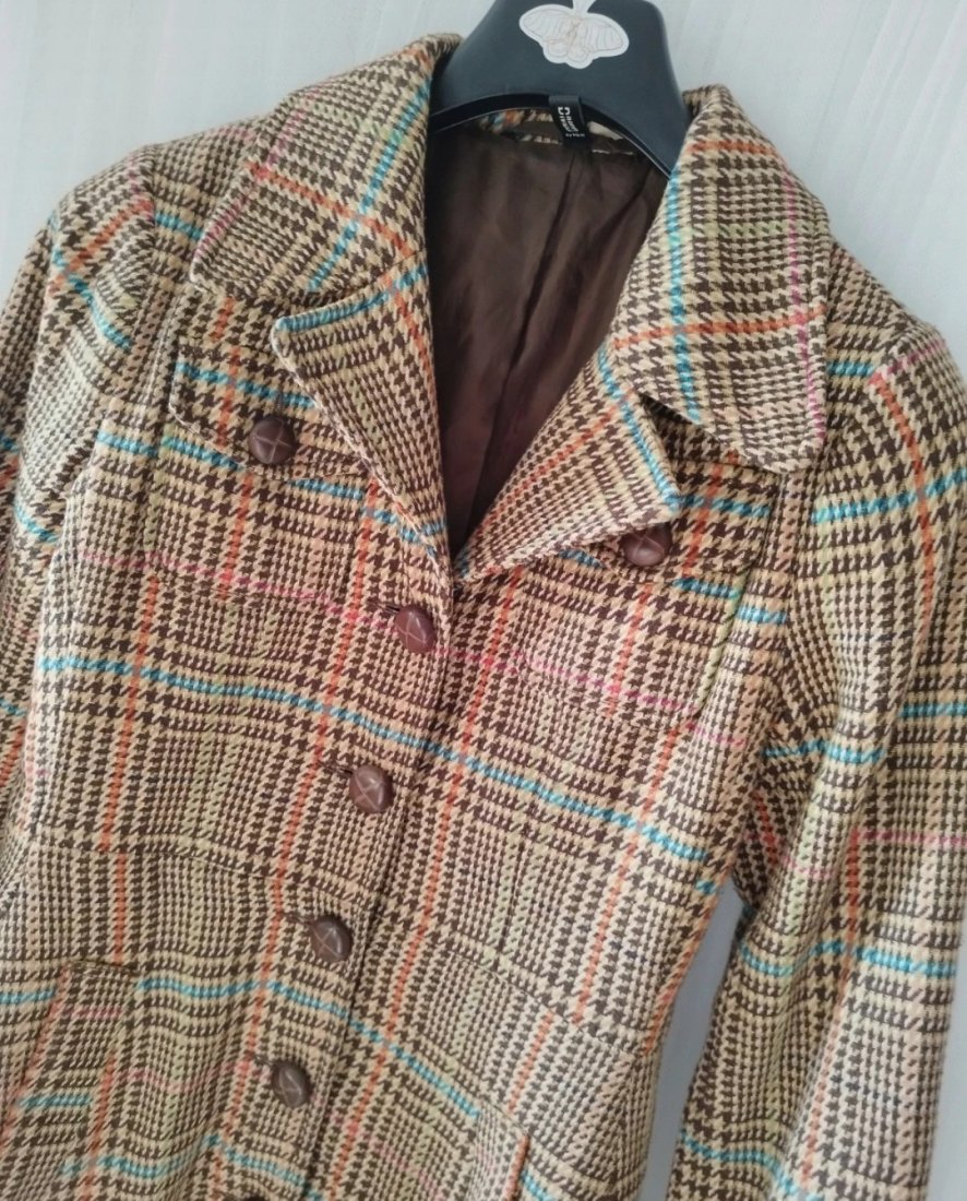 Piękna kratka, stylizowane guziki(+2 zapasowe). Stan idealny, bez wad. Z przodu 4 kieszenie. Z domieszką wełny.