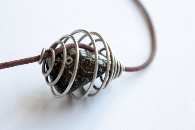Absolutnie wyjątkowy naszyjnik ozdobiony kamieniem umieszczonym w spiralnym metalowym elemencie zawieszonym na brązowym sznurku. Kamień w piękne drobne wzorki. Istnieje możliwość wyjęcia kamienia i noszenia tylko metalowego elementu.
