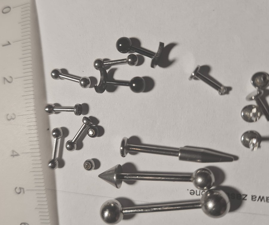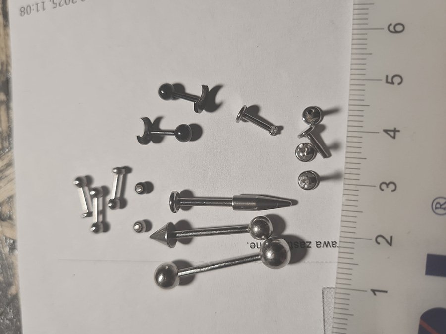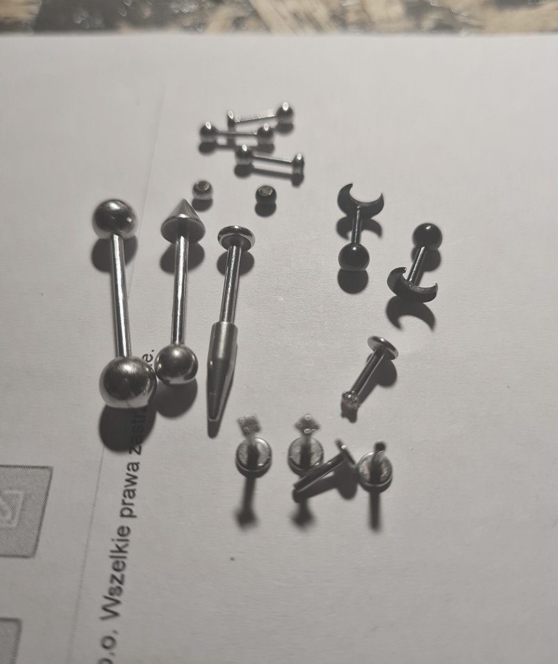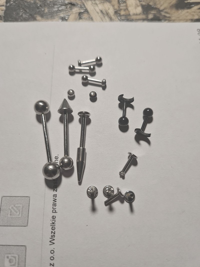 Zestaw widoczny na zdjęciach, labrety z małymi cyrkoniami, sztanga do języka, księzyce (czarne) - wszystko ze stali.