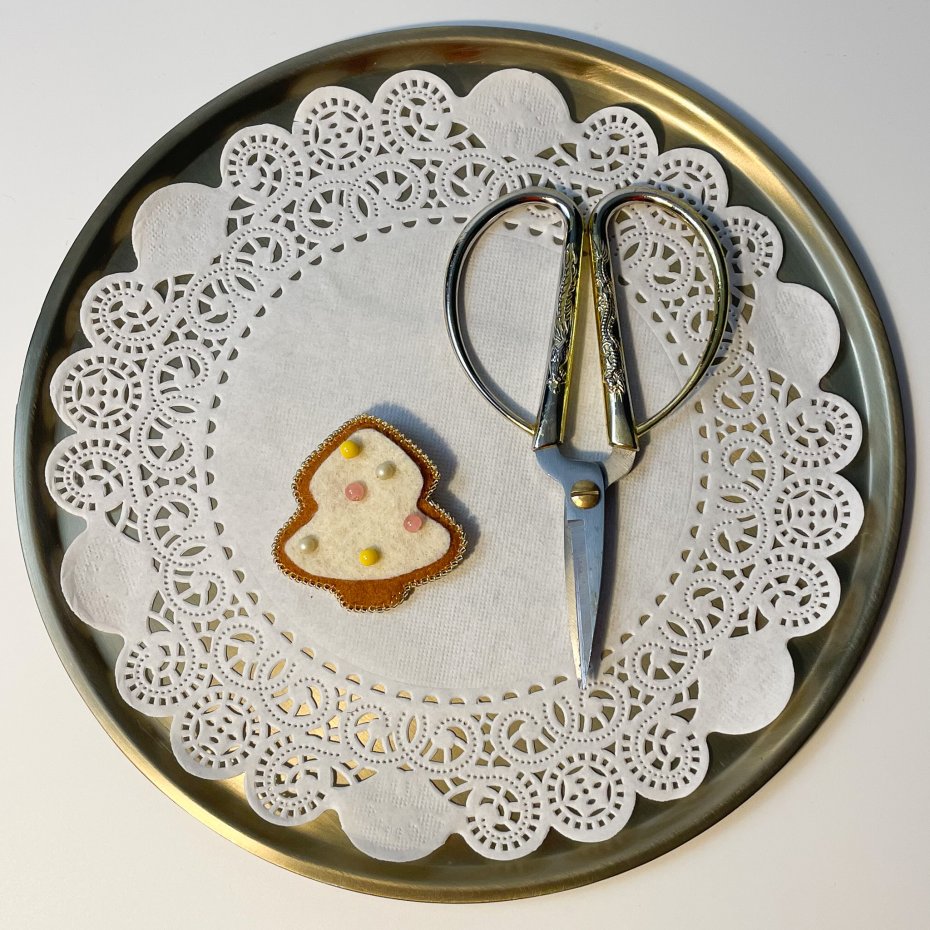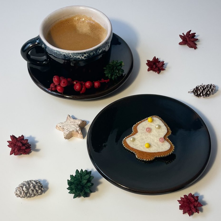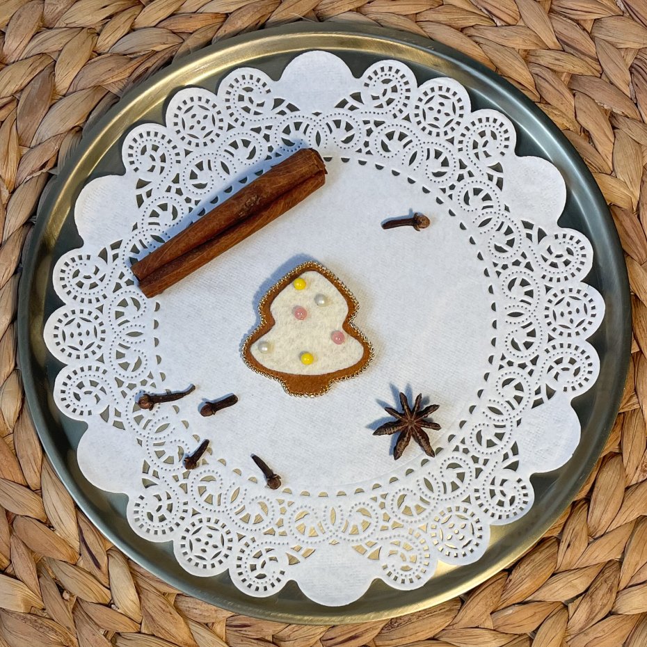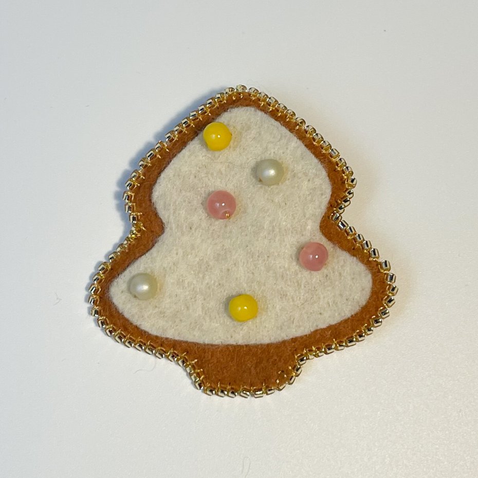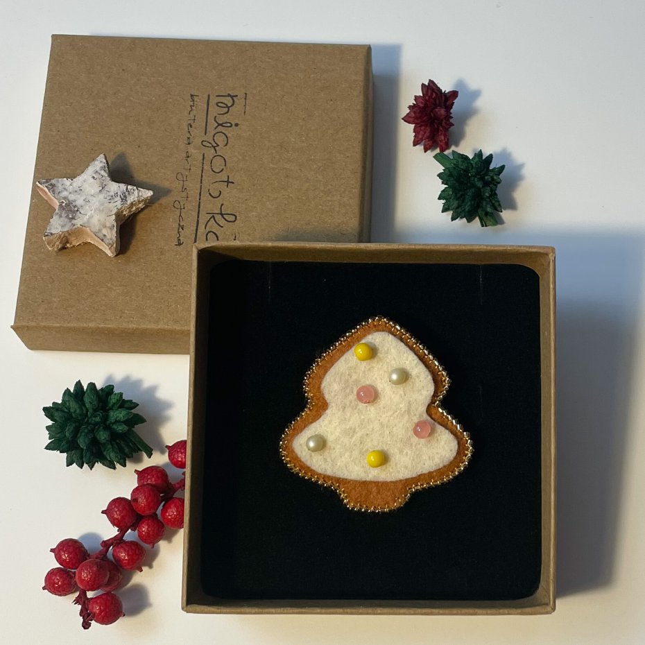 Urocza broszka w kształcie świątecznego pierniczka, wykonana ręcznie z filcu i ozdobiona kolorowymi koralikami, które przypominają lukrowe cukierki. Całość wykończona została złotym obszyciem, które nadaje jej wyjątkowego, ciepłego blasku.