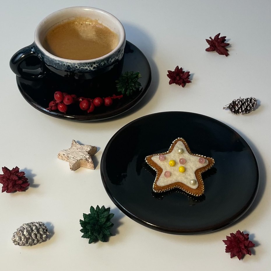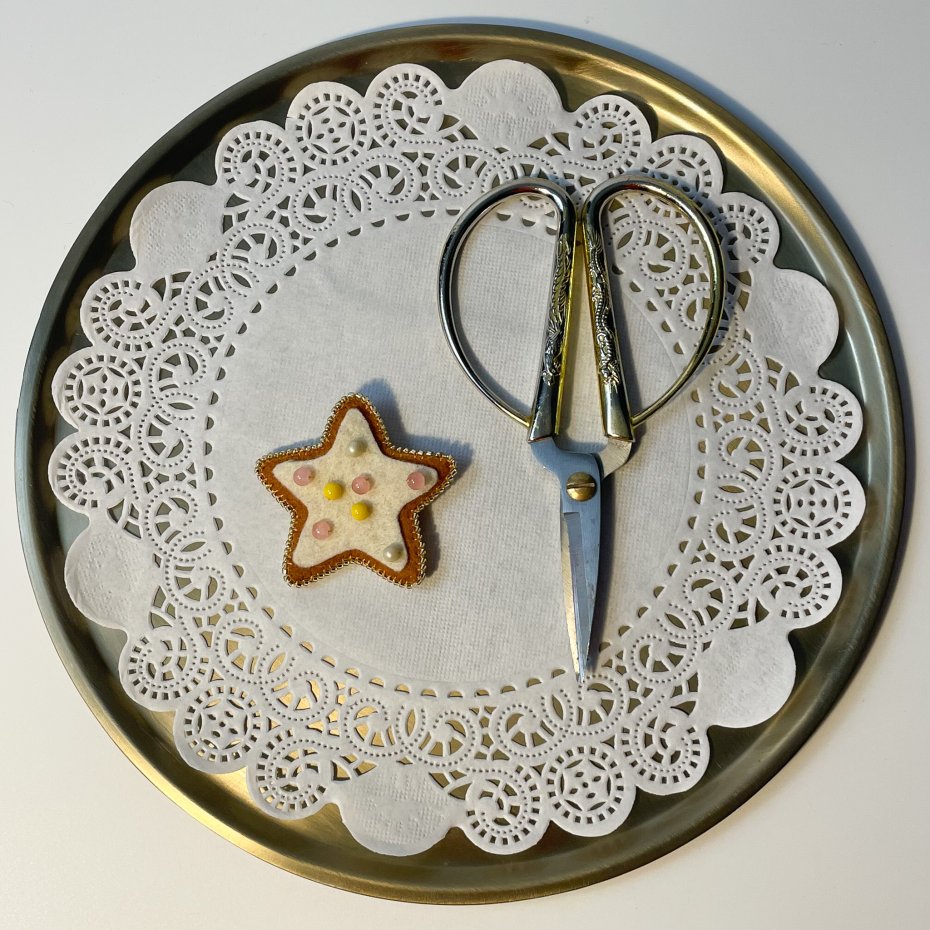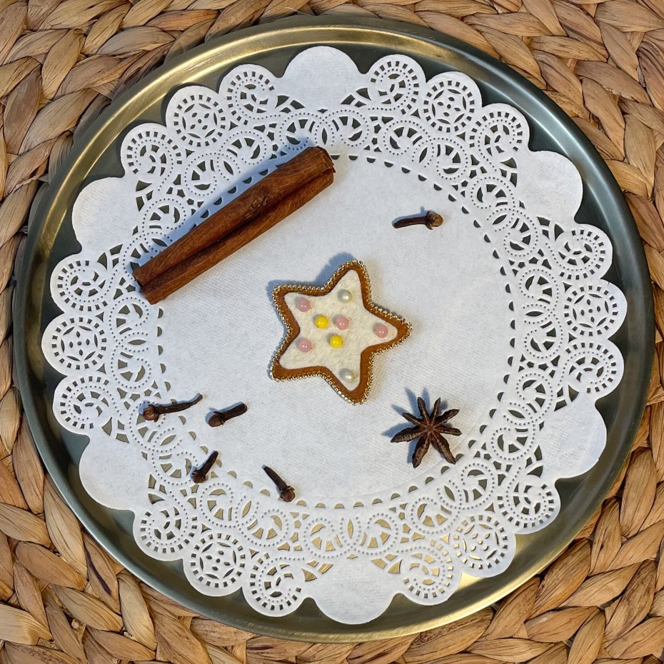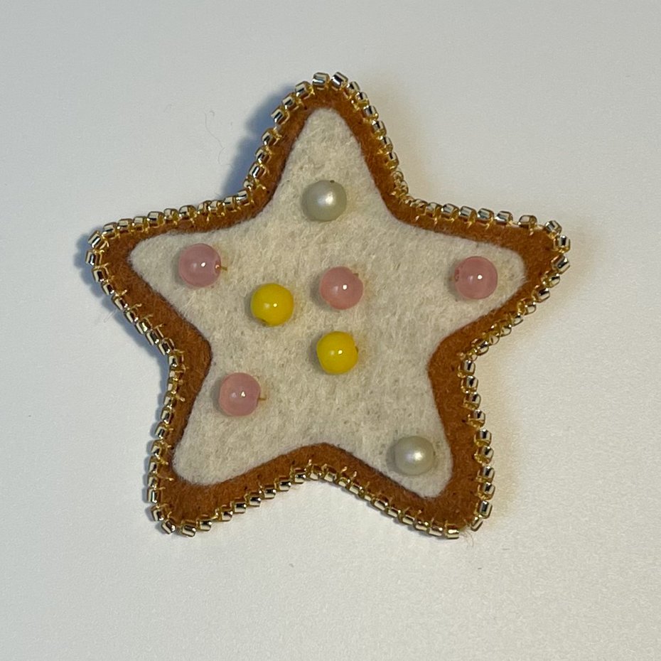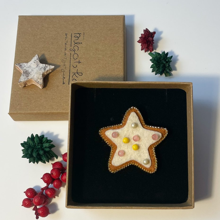 Urocza broszka w kształcie świątecznego pierniczka, wykonana ręcznie z filcu i ozdobiona kolorowymi koralikami, które przypominają lukrowe cukierki. Całość wykończona została złotym obszyciem, które nadaje jej wyjątkowego, ciepłego blasku.