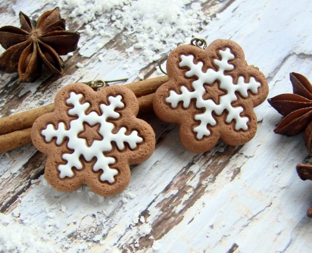 Słodkie świąteczne kolczyki pierniczki z lukrowaną śnieżynką wykonane ręcznie z masy termoutwardzalnej fimo. Wielkość pierniczka: 3 cm
