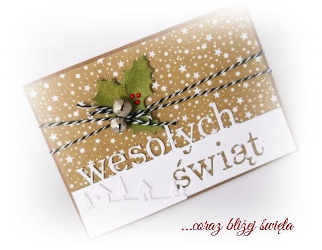 Wyjątkowa kartka świąteczna, prosta w formie i oszczędna w stylu, jednakowoż niebanalna i pełna ciepła. Na rozgwieżdżonym piernikowym niebie zawieszone dzwoneczki i liście ostrokrzewu.