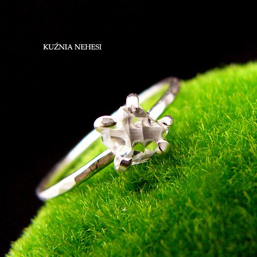 Z najnowszej kolekcji ,, As You Wish ,, Delikatny pierścionek wykonany ręcznie ze srebra oraz przepięknym o idealnym połysku Diamencie Herkimer. Rozmiar obrączki 10,5, fakturowana młotkowana. Kamień z oprawą około 6x6,5 mm. Pierścień wykonam w każdym rozmiarze.Polecam Nehesi © Nehesi Design