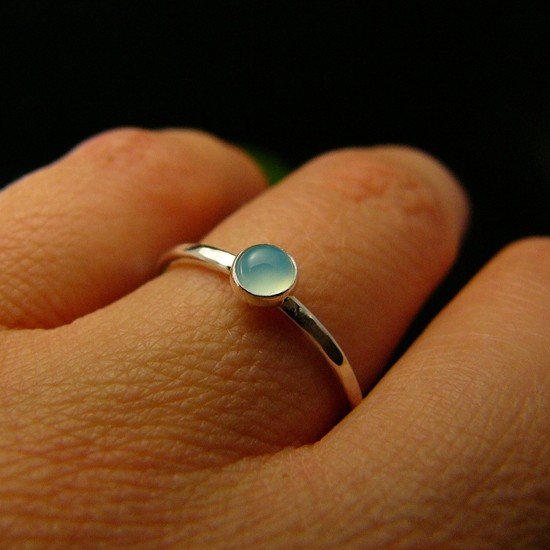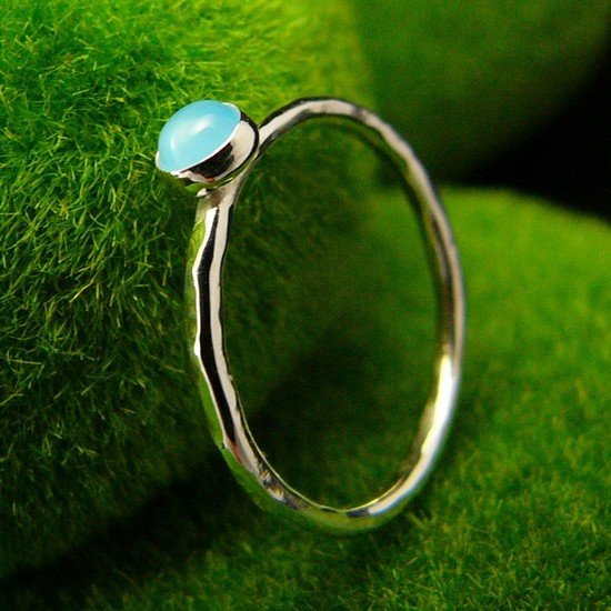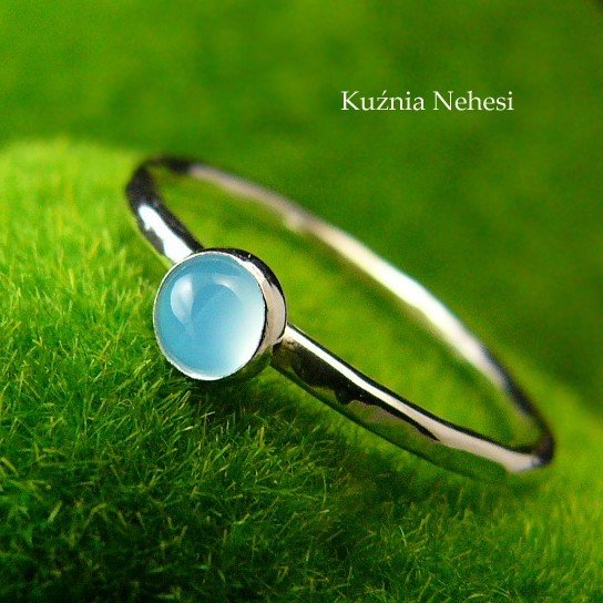 Delikatny pierścień wykonany ręcznie ze srebra próby 925. Sercem jest lazurowy Agat. Całość mocno wypolerowana, powierzchnia srebra fakturowana. Rozmiar obrączki 11 (16,2 milimetrów ). Kamień z oprawą to 4,3 milimetra. Chcesz mieć taki pierścień w swoim rozmiarze lub z innym minerałem, napisz do mnie, a wykonam go dla Ciebie na zamówienie. Jeśli nie znasz swojego rozmiaru, pomogę Ci go dopasować :) Pierścienie drobinki najlepiej wyglądają noszone w zestawach.