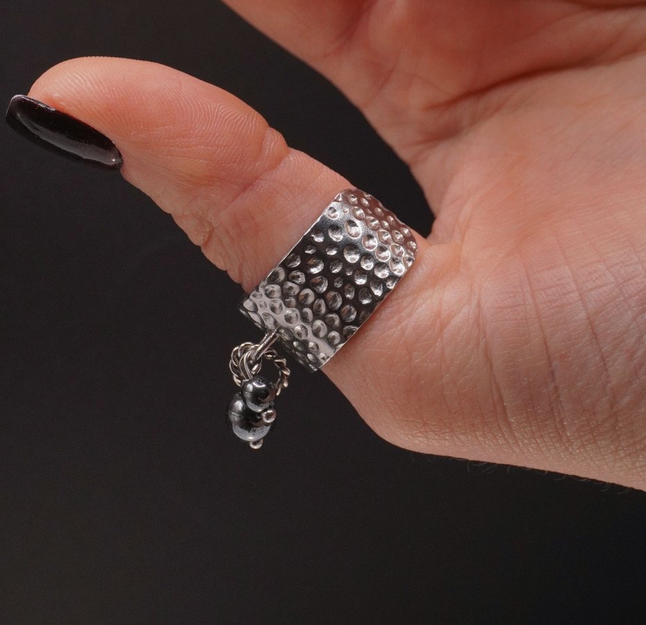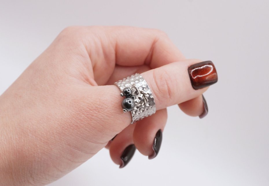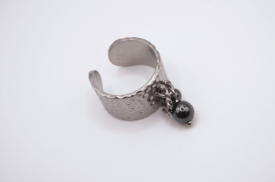 Akcentem są wiszące elementy z naturalnego hematytu — gładkie, ciemnoszare kuleczki o lustrzanym, metalicznym połysku. Ruchome detale tworzą subtelny dźwięk i dynamikę podczas ruchu, dodając pierścionkowi lekkości oraz oryginalności.