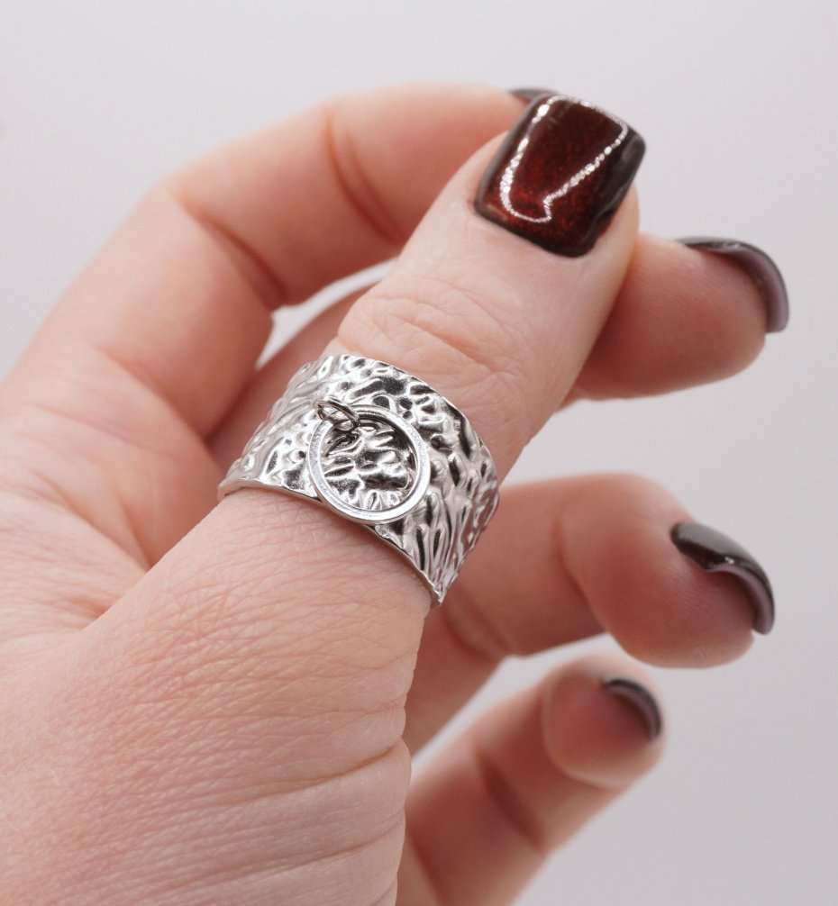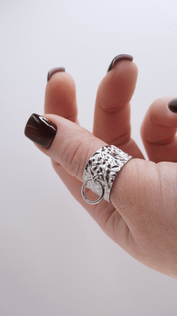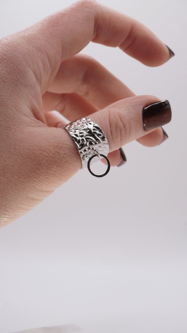 Odważny, fakturowany i przyciągający spojrzenia.Ten pierścionek został stworzony dla tych, którzy wybierają charakter, a nie kompromisy. Reliefowa powierzchnia nawiązuje do organicznych form, a ruchomy element w postaci kółka dodaje dynamiki i lekkiego industrialnego akcentu.