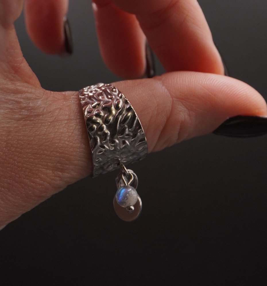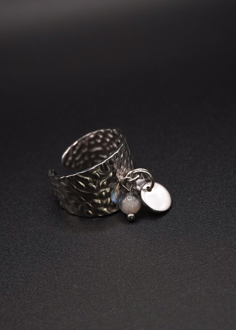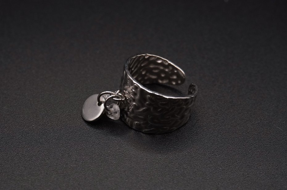 Ten pierścionek opowiada o równowadze siły i światła.Fakturalna powierzchnia ze stali nierdzewnej przywodzi na myśl naturalną, "żywą" formę, a ruchome zawieszki dodają biżuterii głębi i gry przy każdym ruchu dłoni.