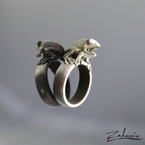 Pierścionek z dekoracją w kształcie żaby śpiewającej, wszystko wykonane ze srebra.