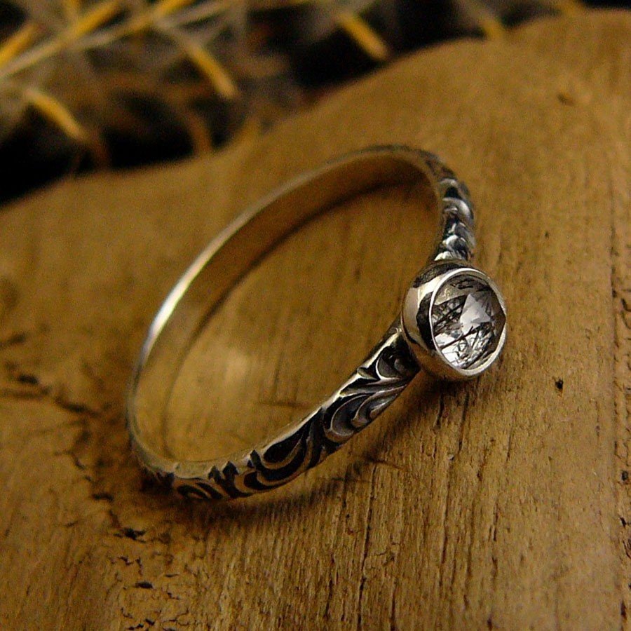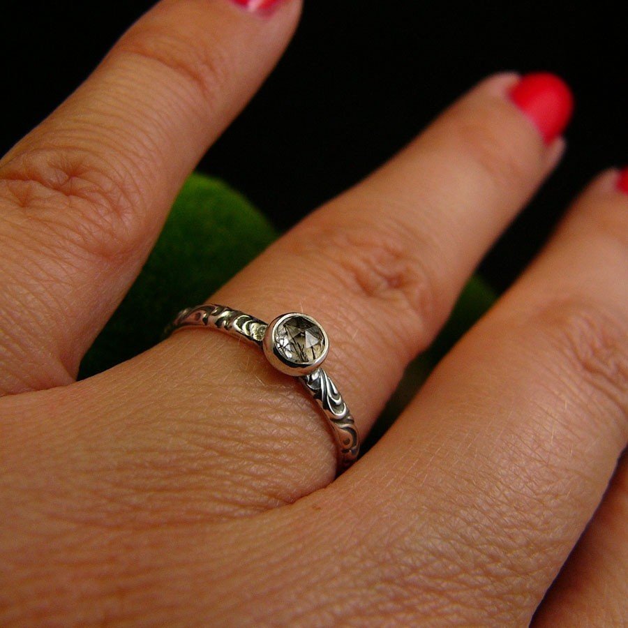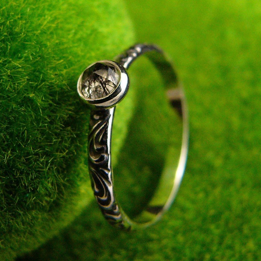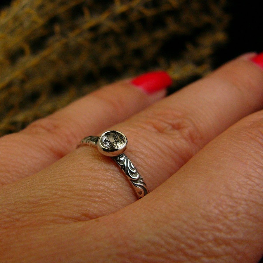 Uroczy drobiazg – pierścień z kolekcji ,, Z Ogrodu Elfów ,, sercem jest przepięknej urody naturalny fasetowany Kwarc z niteczkami czarnego Turmalinu, zakuty został na przepięknej rzeźbionej obrączce w florystyczne wzory. Zdjęcie nie oddaje w pełni barwy kamienia, jest w 100% naturalny. Pierścień wykonany ze srebra 925, ręcznie oksydowany, cechowany wypolerowany na wysoki połysk. Rozmiar obrączki 13,5 ( 17 milimetra). Nie Twój rozmiar? nic nie szkodzi, mogę go powiększyć lub zmniejszyć dla Ciebie na zamówienie – napisz do mnie.