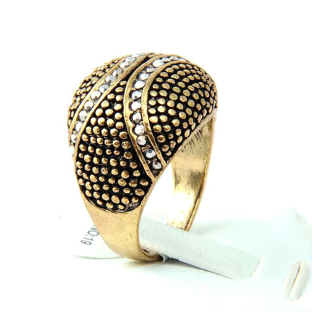 Duży masywny pierścionek w kolorze złota, zdobiony cyrkoniami.