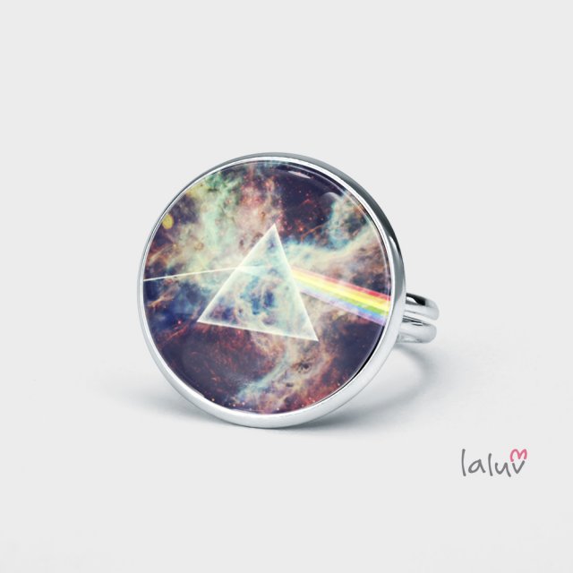 Ręcznie robiony pierścionek z wysokiej jakości grafiką zamkniętą pod wypukłym szkiełkiem i oprawioną w bazę w kolorze srebrnym.