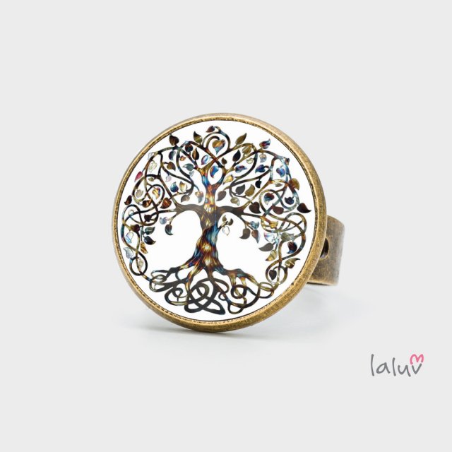 Ręcznie robiony pierścionek z wysokiej jakości grafiką zamkniętą pod wypukłym szkiełkiem i oprawioną w bazę w kolorze antycznego złota.
